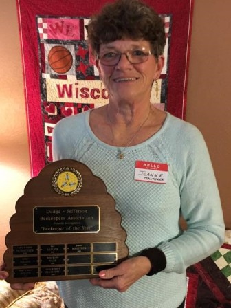 At their annual banquet on December 3, Jeanne Malterer of Iron Ridge was recognized as Beekeeper of the Year by the Dodge-Jefferson County Beekeepers Association. A member since 2003, Malterer has been a past president of the bee club, chairs the Dodge County Fair Honey Booth committee, and has contributed greatly to the group’s annual beekeeping activities. An advocate for healthy bees and local, quality honey, Malterer manages about 10 hives and sells her product at area farm markets and local shops.